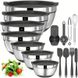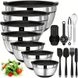 Durable & High Quality Stainless Steel: AIKKIL bowls set are constructed of mirror-finish interior and fingerprint-proof matte-finish exterior, which is durable and rustproof. High-quality food grade stainless steel for fingerprint-proof will never retaining any odors.Thicken the edge of the bowl makes them easier to hold. Elegant look and convenient design will be your great helper in the kitchenNon Slip Silicone Bottoms: Each of the bowl comes with silicone bottom to keep the bowl from moving around on the countertop while mixing, kneading or whipping food, you can easily mix all your favorite ingredients and foods and need not to worry about the bowls will wobble when mixing, beating and whippingNo-Deformed &Tight Lids: Unlike other mixing bowls on the market, our airtight lids not warp or deform, closely fit the bowls, keep your food fresh, tight fitting lids are great for food storage, great choice for storing food for longerExtra Value Accessories & 7 Sizes Nesting Bowls Set: Super versatile combination set including 6 size mixing bowls0.67, 1, 1.5, 2, 2.5, 3.5, 7 quart, meet your various kinds of kitchen needs, comes with basting brush, spreader spatula, flexible spatula, egg whisk, egg separator and 6 measuring spoons for better helping you cook more easilyNesting & Easy To Clean: These bowls seamlessly nests together creating an uncluttered and organized effect in your cabinets, while saving space. Bowl sizes also fit on your standard size refrigerator shelf, cabinets and pantry, perfect for as a housewarming or wedding gift christmas gift, Simple to clean by hand and dishwasher safe. For the tightness of the lid, please hand-wash the lids