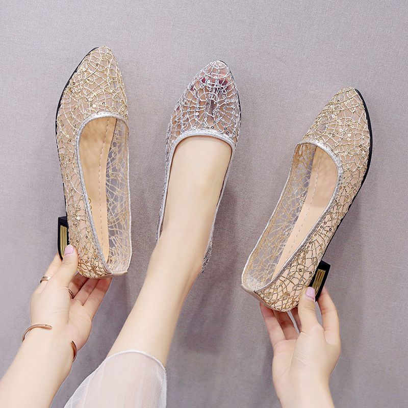 2025 Spring New Hollow Lace Pointed Low Heel Shallow Mouth Peep Toe Mesh Single Shoes For Women
