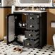 30-inch bathroom vanity with glass door, adjustable shelves and three drawersTransform your bathroom into a haven of elegance with our 30-inch black vanity. Featuring a pristine ceramic basin and luxurious golden round handles, this vanity is the epitome of sophistication. The patterned glass doors add a touch of artistry, elevating the entire room.Ample storage with a deep drawer, two shallow drawers, and a shelf ensures your essentials are neatly organized, while the compact design (30.0418.5833.97 inches) maximizes space. Easy to clean and maintain, this vanity keeps your bathroom effortlessly fresh.Experience the seamless blend of beauty and functionality, and let your bathroom exude charm and grace every day.Elegant Luxury, Exquisite DetailsFeaturing patterned glass doors and luxurious golden round handles, this vanity adds a touch of sophistication to any bathroom.Powerful Storage, Perfectly OrganizedWith one deep drawer, two shallow drawers, and spacious cabinet space, easily store clothing, towels, and toiletries.Sturdy and Durable, Easy to MaintainCrafted from waterproof, durable materials, this vanity is built to last and is easy to clean, ensuring long-term use.Weights&DimensionsProduct Size:30"W*18"D*34.06"H, 101.85 lbsSink:30"W*18"D*6.25"H,33.07 lbsVanity:29.22"W*17.83"D*33.27"H, 68.78 lbsSuit Package(N729P183679B):36.60"*22.00"*20.75", 118.61 lbsWeight Capacity:Shelf: 35 LBS, Drawer: 22 LBS, Overall: 220 LBSSpecificationsProduct Name:Bathroom VanityOrigin:VietnamStyle:TransitionalMounting Type:Free-standingCabinet Color:BlackSink Material:CeramicCabinet Material:Solid wood+MDF+GlassHandle Material:Zinc AlloyFinish Type:Painted FinishSink Type:Undermount/Drop inSink Shape:RectangularOverflow Hole included:YesFaucet Mount:8" widespread(not included)Vanity Top Edge Type:FlatEdge Thickness:0.5"Number of Doors:1Number of Drawers:3Soft Close Door Hinges:YesAssembly:Assembly RequiredNumber of packages:1