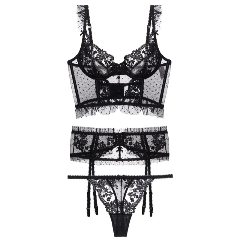 Sexy Lingerie Women Thin Transparent Lace Push up Bra Set Embroidery Bra+Garters+Thong 3 Piece Set