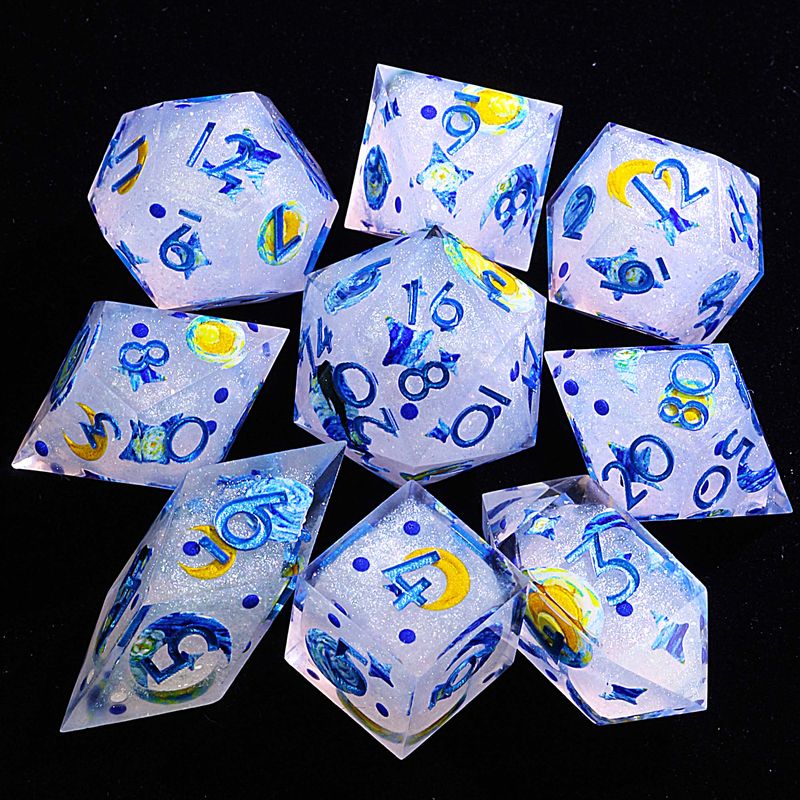 This DND dice set is named "Starry Night Mirage Dice", where every roll swirls with the delirious magic of a painter's dream. When your artillerist artificer channels chromatic chaos or your mad prophet sorcerer interprets omens in brushstrokes, these dice don't fall—they swirl, their alabaster cores blazing with captured auroras as Van Gogh's whirling stars and crescent moons spiral across the facets like a universe being rewritten with every toss. That dizzying moment when the entire night sky condenses into a 20? The Star-Eyed Muse deciding whether to let you glimpse eternity... or drown you in cobalt madness.