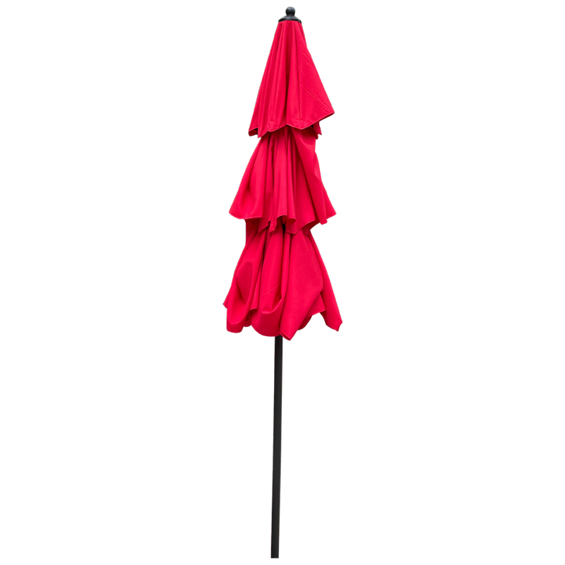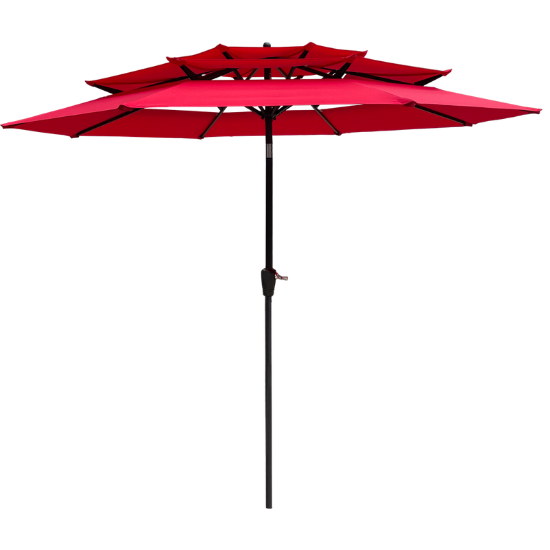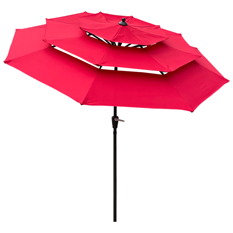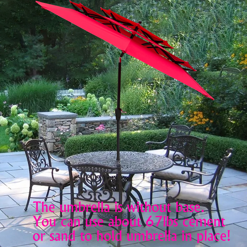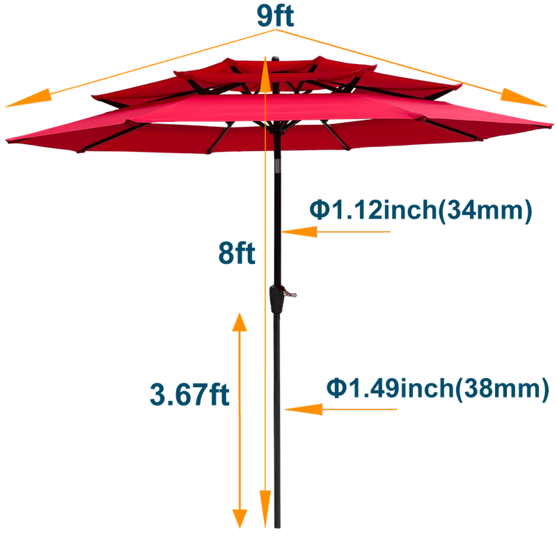 Product Features In the summer, it's very comfortable to organize activities or lie down outdoor, however, there's definitely a premise: you need a piece of shade to protect your skin from the sun. Here comes a 3 tiers patio umbrella, which provides you with such a large shade to enjoy the beautiful life of summer. Finished with a crank lift, 3 tiers patio umbrella can be easy to open and close by crank, making it the ideal go-to item when the sun comes out to shine. The push-button tilt technology also makes tilting the patio umbrella effortless for maximum shade. So It is ideal for you to shade and rain protection(base is not included). Simple assembly without tools gives you more convenience. Installation instructions and installation videos are available for reference. Close or remove during windy or inclement weather to avoid falling over in stand (base is not included). Description 【Weight & Dimensions】 Umbrella Shade Size: 108"(Dia) x 96"(H) Pole Size: 1.49"(Dia) x 96"(H) Package Dimensions: 56.69" X 7.87" X 7.87" Net Weight: 14 lbs Gross Weight: 17 lbs Country of Origin: Made in China Recommended Counter Weight 67 lbs (30kg) Canopy Shape: round,without flap Pole Color: Black Canopy Material: Polyester Pole Material: Steel Rib Material: Steel UV Protection (UPF): 40+ Canopy Durability: Weather Resistant; Water Resistant;UV Resistant Color Fastness: Up to European Standard Level 4 Wind Vent: Yes Number of Tier: 3 Opening Mechanism: Crank Lift Tilt: Yes Tilt Method: Push button Angle Of Inclination: 45 Degrees Adjustable Height: No Lighted: No Package Includes: 1 x 9Ft 3-Tiers Outdoor Umbrella; 1xInstruction Stand Included: No Installation Required: Yes Level of Assembly: Partial Assembly Adult Assembly Required: Yes Suggested Number of People: 1 Additional Parts Required: Yes Assembly Instructions Included: Yes Commercial Warranty: No Product Warranty: Yes Full or Limited Warranty: Limited