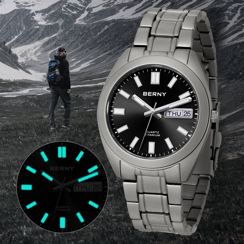 BERNY Titanium Watches For Men 10ATM Waterproof Super Luminous Quartz Analog Watch With Day Date Sapphire Crystal Sport Casual Wristwatch