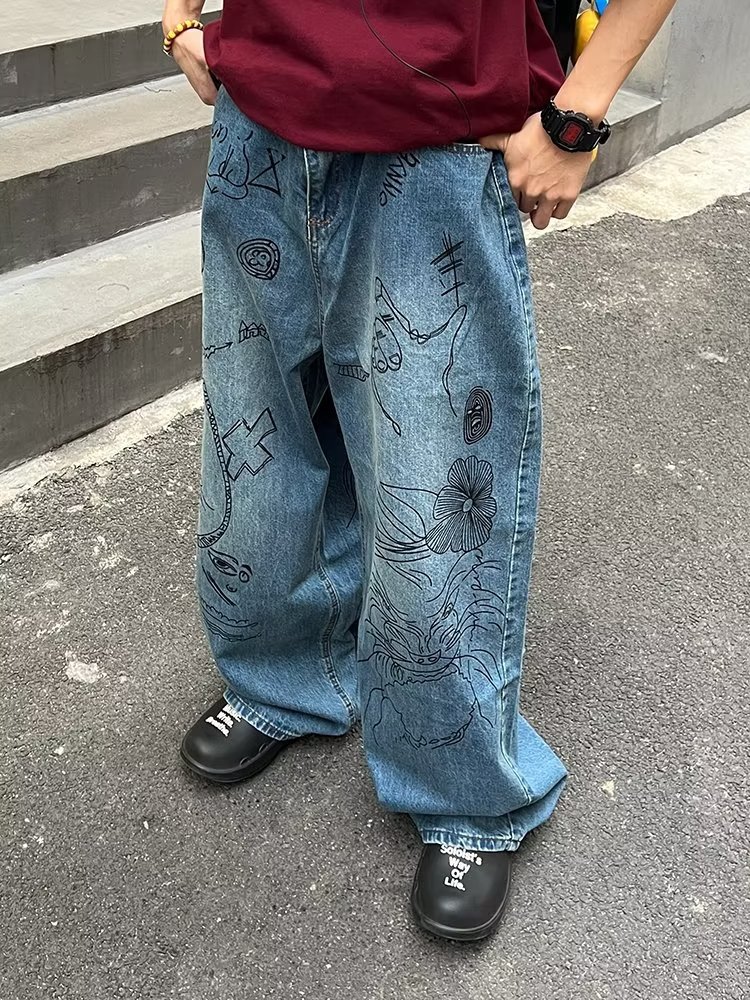 Graffiti jeans men's Korean version trendy high street ruffian handsome 2024 spring/summer new personalized wide leg denim pants