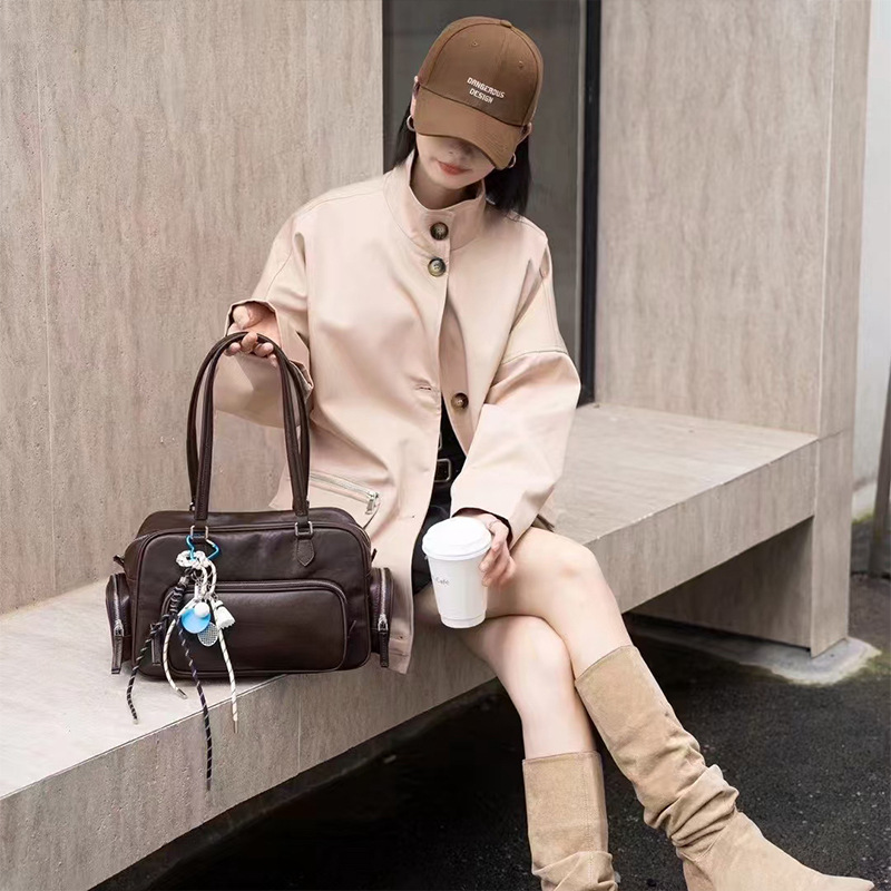 Boston women's bag 2024 new multi pocket niche leather motorcycle bag women's large capacity single shoulder armpit bag
