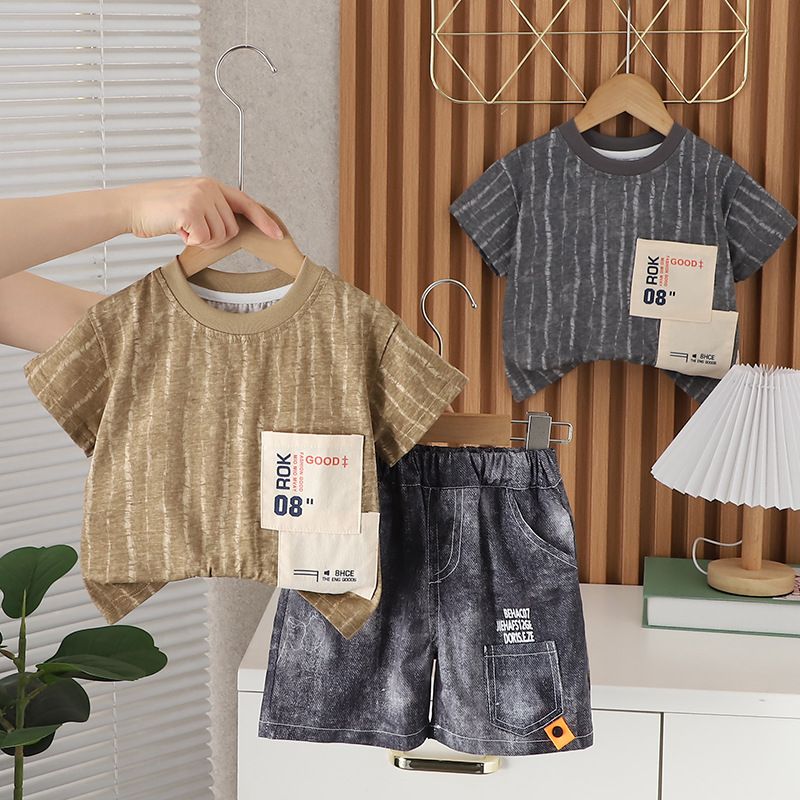Boys' two-piece set of western-style thin and trendy clothing, children's double patch pockets, short sleeved baby