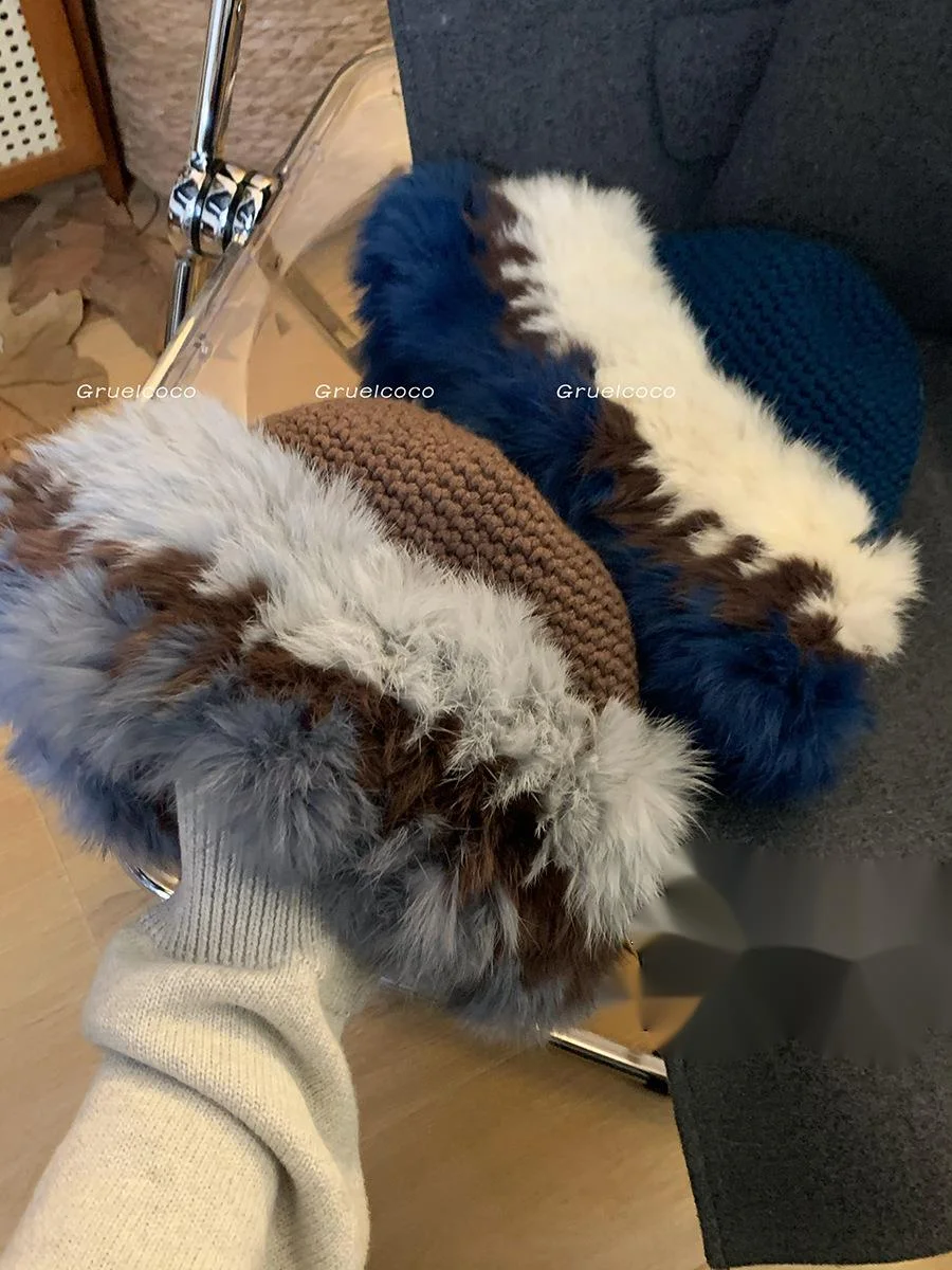 Congee Cocoa Rabbit Hair Knitted Hat Women's Autumn and Winter Splice Warm Wool Hat Cold proof Pullover Plush Ear Protection Baotou Hat