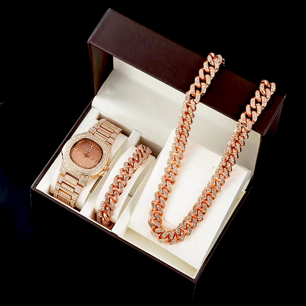 Cuban Chain Watch Bracelet Three piece Jewelry Personalized Fashion Set Hip Hop Full Diamond Necklace