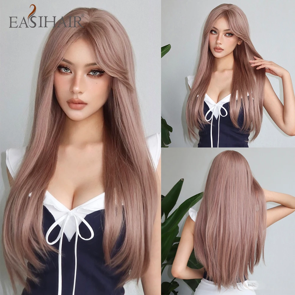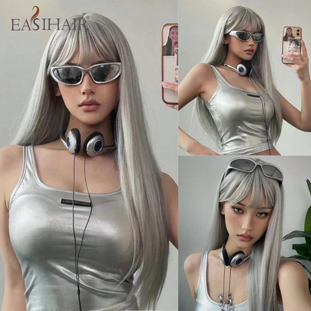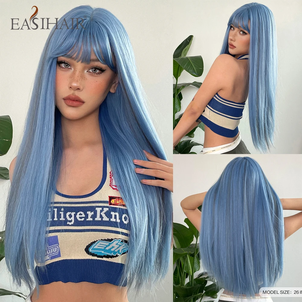 EASIHAIR Long Silky Straight Synthetic Wigs with Bangs Black Cosplay Party Lolita Hair Wigs for Women Natural Heat Resistant Wig