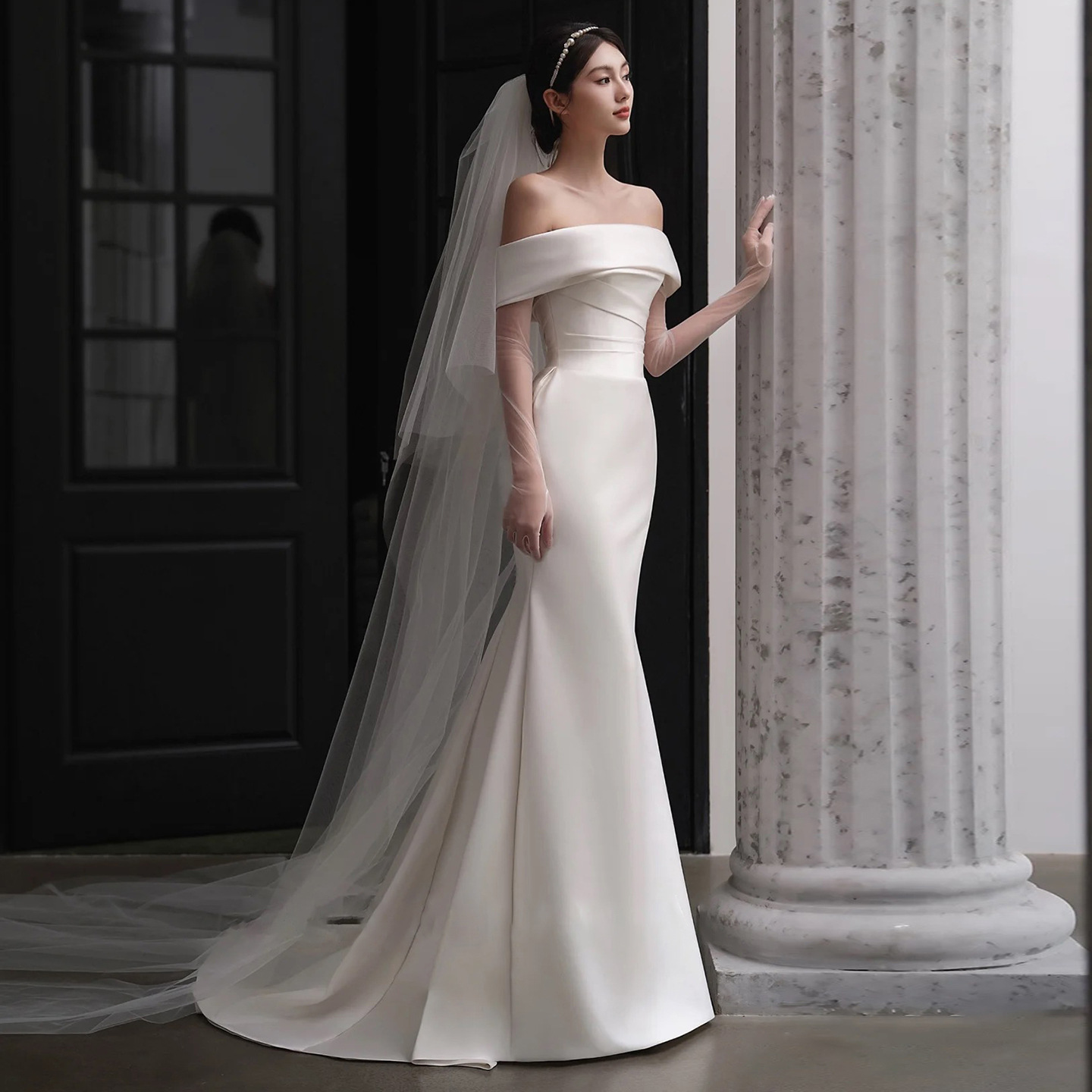 Elegant Satin Mermaid Wedding Dress With Off-Shoulder Neckline & Detachable Train – Timeless Bridal Gown For Modern Brides