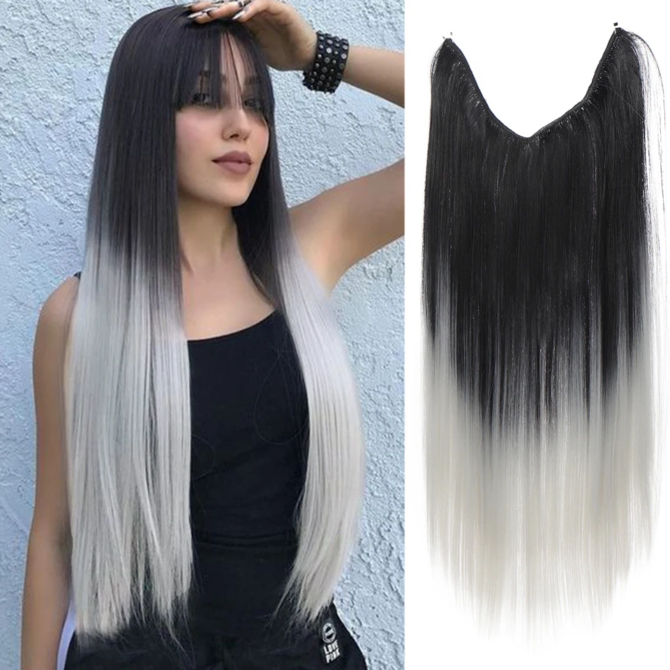 Synthetic non-clip invisible steel wire hair extension straight hair black gradient gray integrated Synthetic wig hair extension