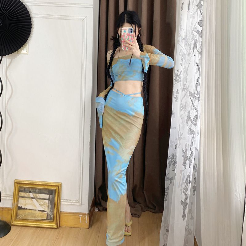 French Swe And Spicy Style Top For Women, High-End Unique Stunning Beach Vacation Gradient Mesh Long Skirt Two-Piece