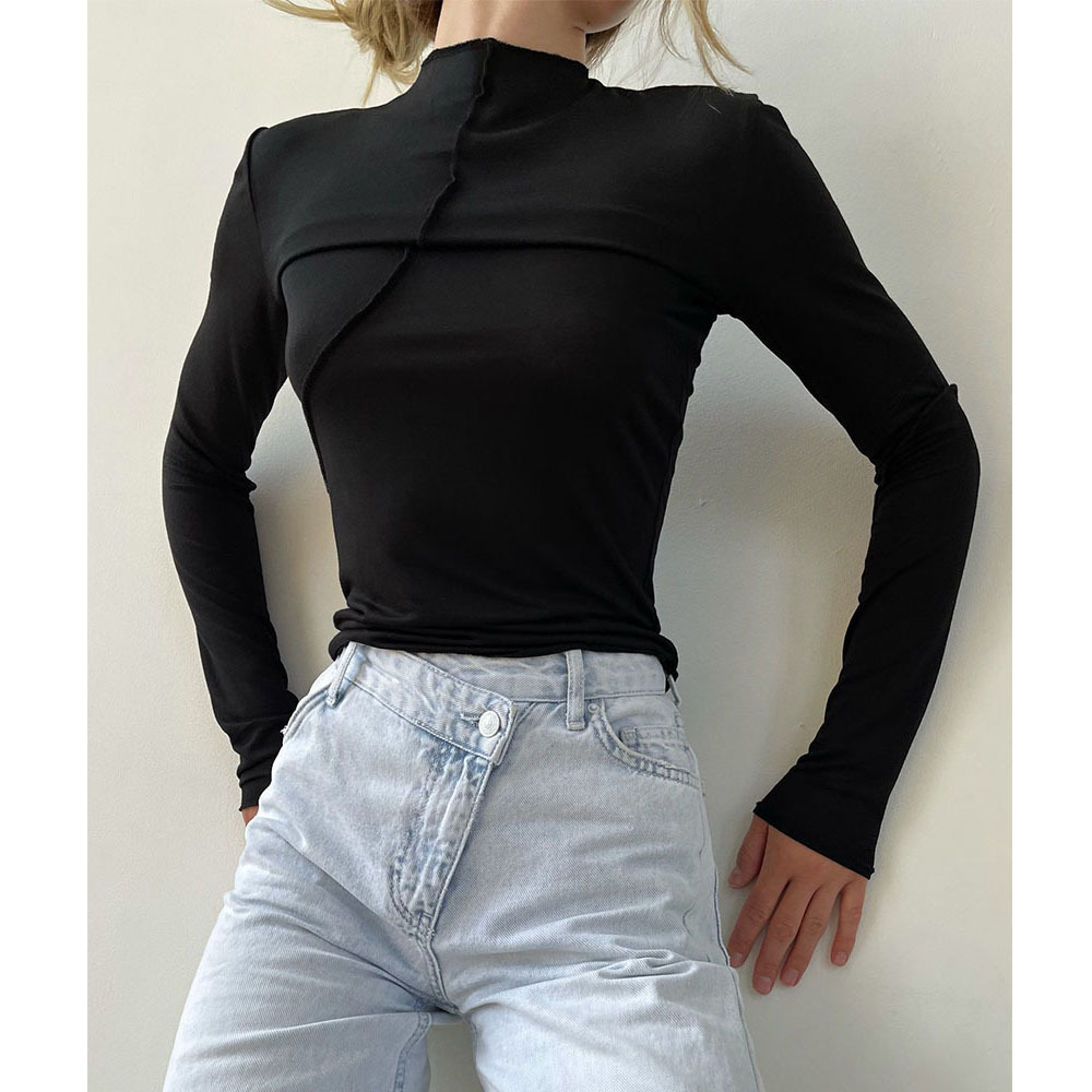 Half high neck base shirt with spring trend slanted edge splicing design, elastic slim fit long sleeved T-shirt