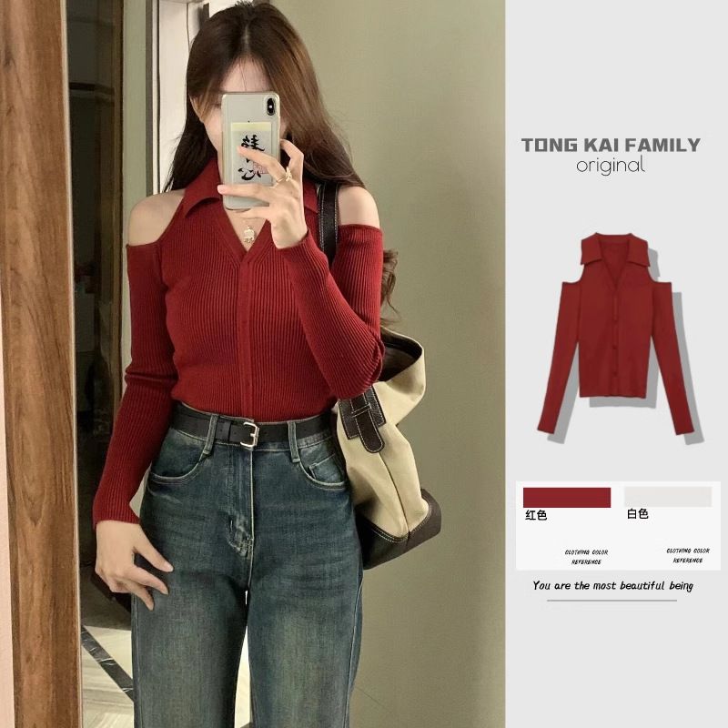 Hong Kong style red top for women in autumn and winter, with a niche design, featuring a lapel collar, long sleeves, and off the shoulder knit bottom layer
