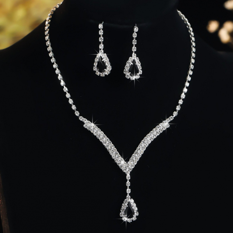 Hot sale creative design fashion diamond V neck water drop pendant versatile bridal earrings necklace three piece set