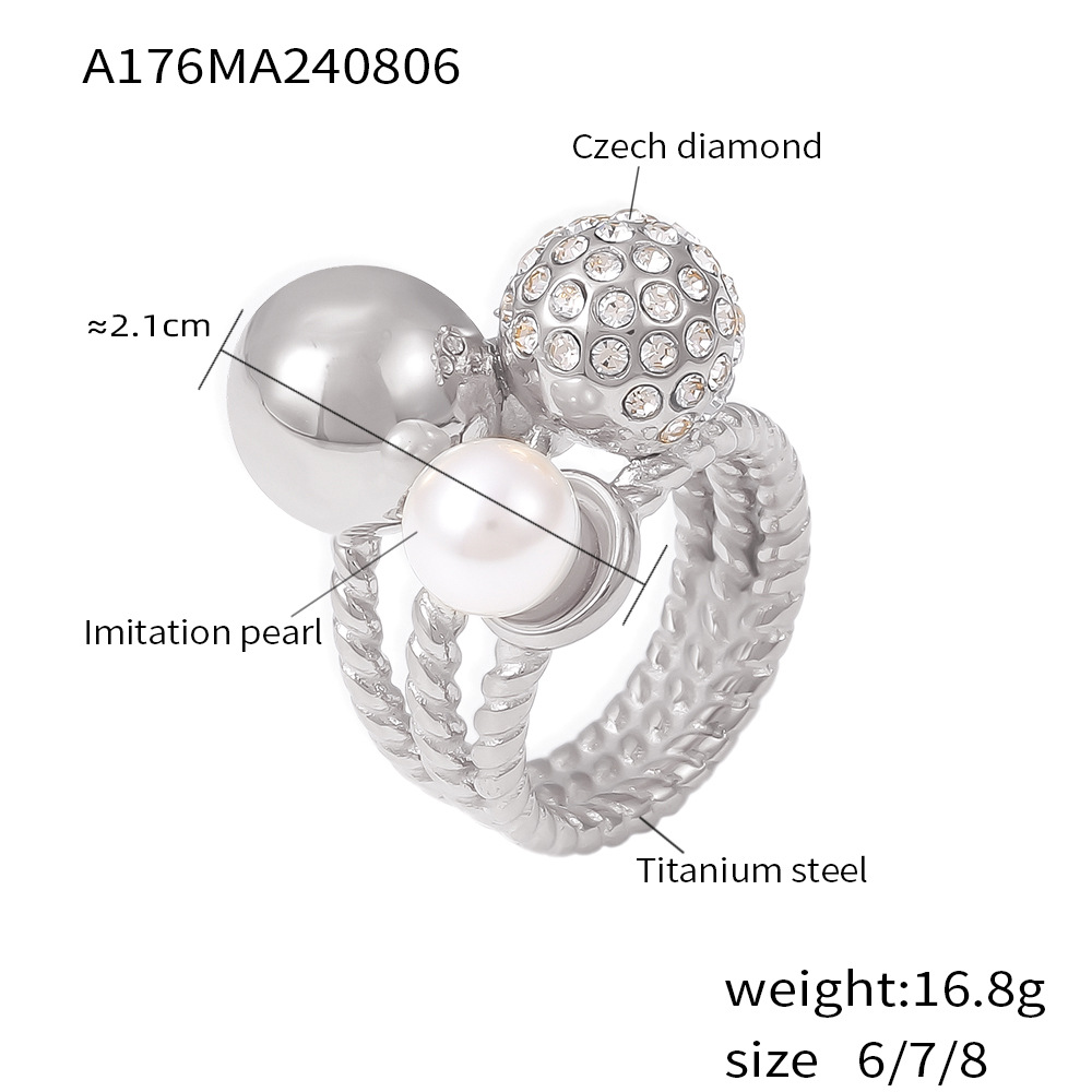 Imitation Pearl Retro Czech Diamond Round Bead Ring Titanium Steel Light Luxury Temperament Versatile Ring