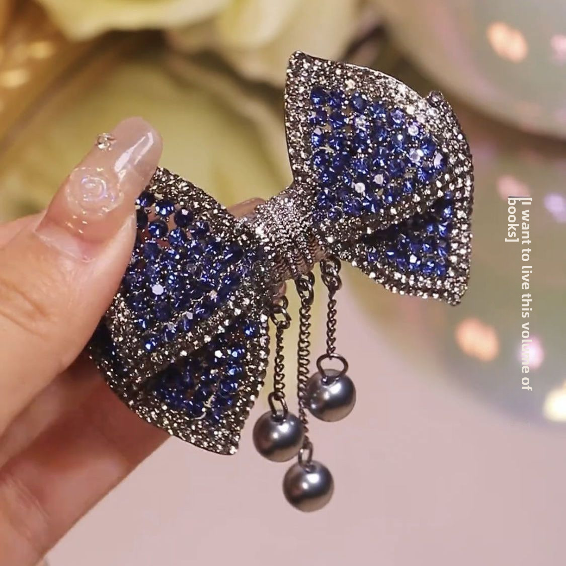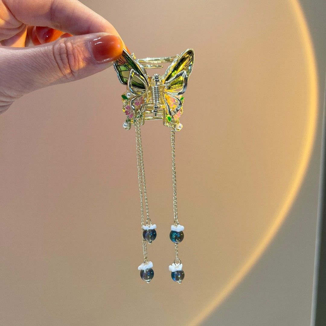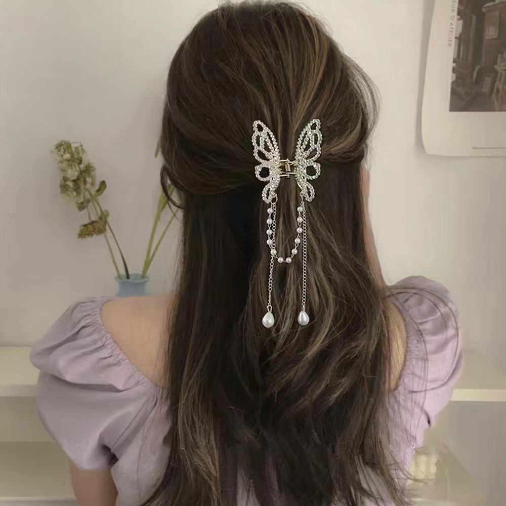 Korean style new Pearl butterfly tassel clip female light luxury back Head Small size hairpin elegant temperament shark clip net