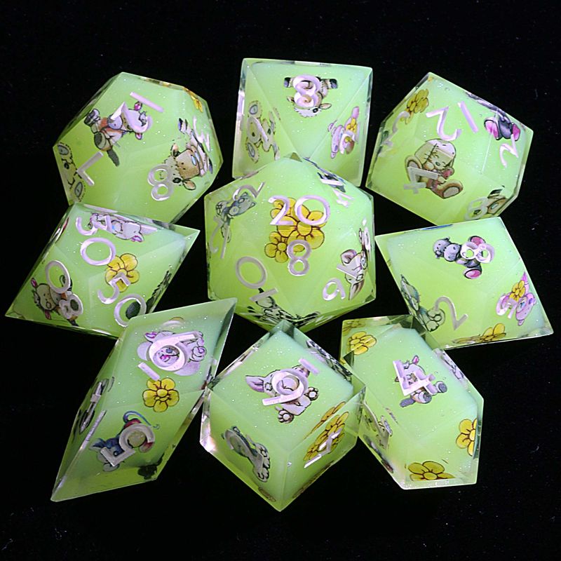This DND dice set is named "Hope Sprout Farm Dice", where every roll feels like the first warm ray after a storm. When your shepherd druid comforts frightened animals or your halfling farmer-turned-hero tends to wounded allies, these dice don't clatter—they tumble like baby animals learning to stand, their glow-in-the-dark resin pulsing with soft encouragement while those downcast creature decals slowly perk up with each successful roll. That wobbly final turn? Just a little lamb finding its footing again.