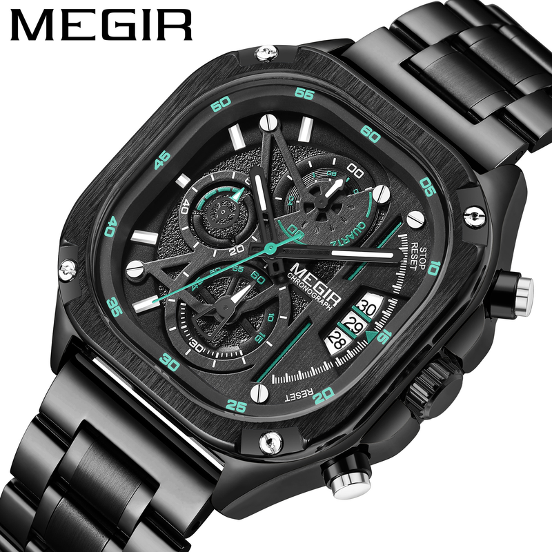 Megir Square Watch Men's Steel Band Glow Waterproof Calendar Multi functional Sports Watch