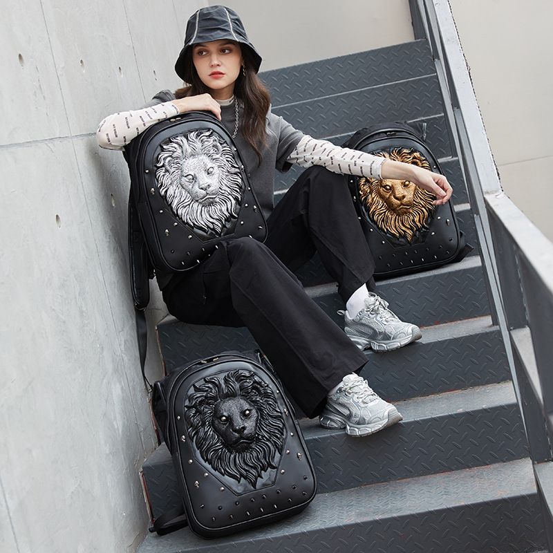 New 3D personalized lion head backpack for men and women, waterproof PU leather hat bag for travel