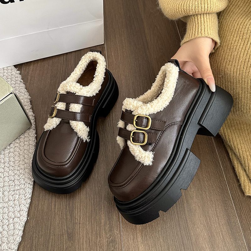 Plush cotton Le Fu Mary Zhen small leather shoes, 2023 autumn winter new item, sponge sole, warm and height increasing