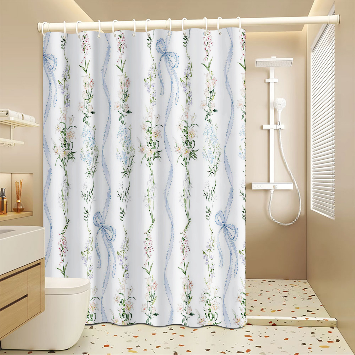 Polyester waterproof and mildew-proof shower curtain set, no nails or drilling required, easy to install, suitable for dormitory shower rooms, separates wet and dry areas