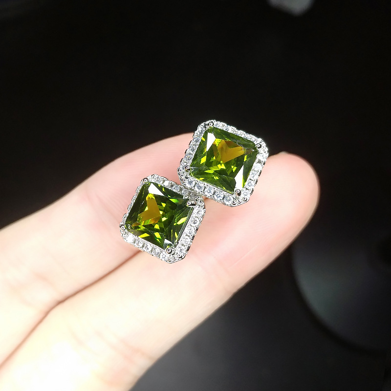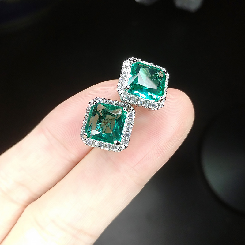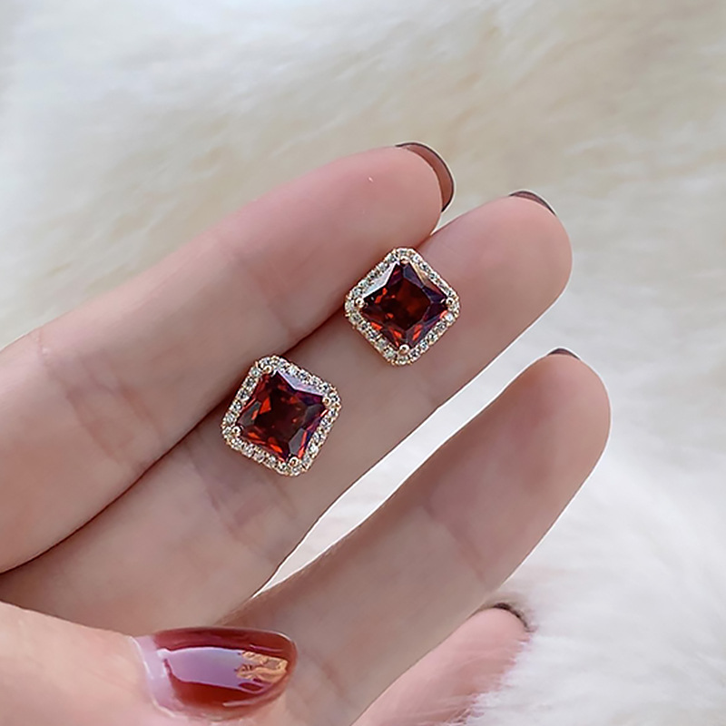 Princess bag high-end feel inlaid 1 carat square high-quality Mozambique garnet earrings plated with silver