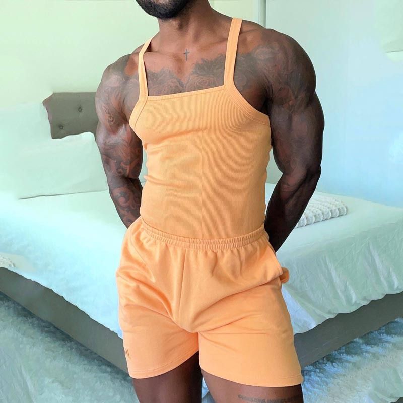Purchase by Size Chart 2024 Summer Men's Solid Color Knitted Strap Shorts Casual Sports Two Piece Set