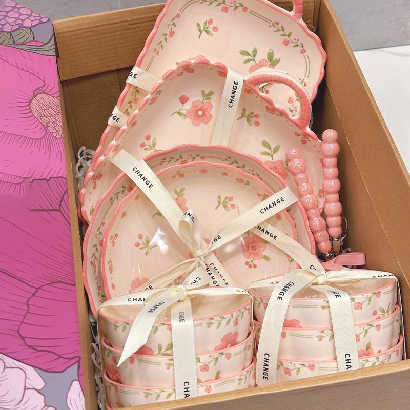 Romantic Pink High-Value Bowl Plate Set Home Use, Beautiful For Girls, Dining Bowls And Plates, Ceramic Underglaze Color