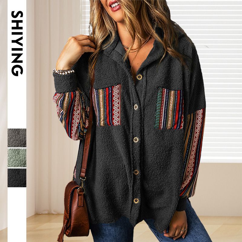 Shiying corduroy shirt for women, checkered contrasting color, single breasted lapel, long sleeved, versatile outerwear for women