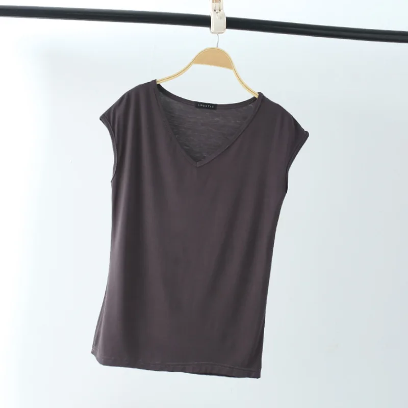 Solid V Neck Basic Tshirt Women summer modal Loose Tee Tops Casual undershirt M to 2XL