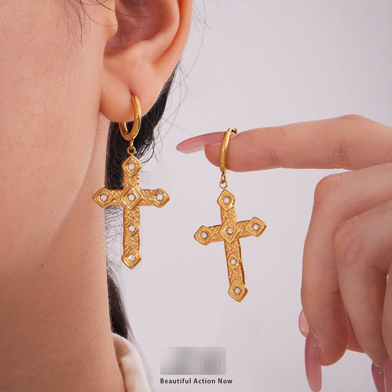 Square Sugar Cross With Zircon Eardrops, Elegant Female Earrings, Titanium Non Fading Earrings