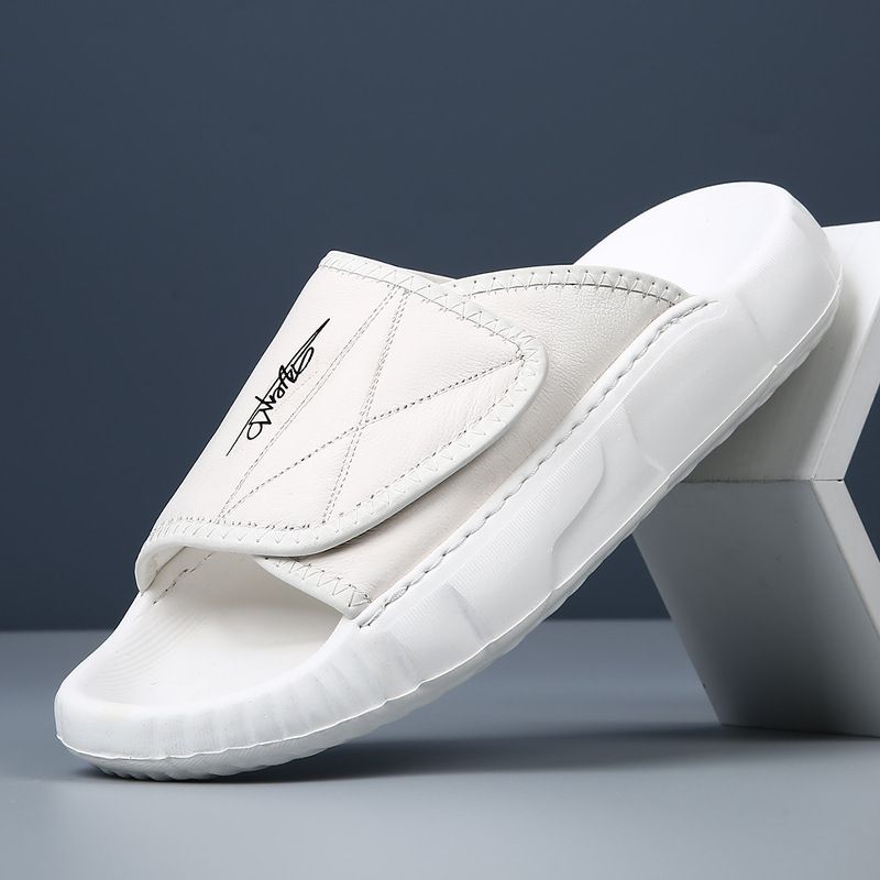 Summer top layer cowhide slippers for men's home, high-end indoor leisure, cool slippers, soft bottom, anti slip white men's slippers