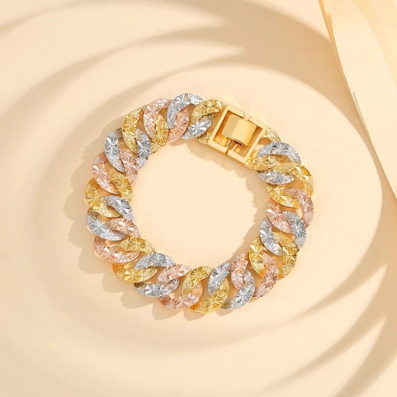 Elevate your street style with this tri-color gold plated textured Cuban link bracelet! Featuring a chunky chain design in gold, rose gold, and silver tones, with intricate geometric textures, this bracelet blends hip-hop flair with bold sophistication. The multi-tone finish and substantial Cuban link structure create a striking, eye-catching look perfect for daily wear, hip-hop inspired outfits, or adding an edgy touch to any ensemble.