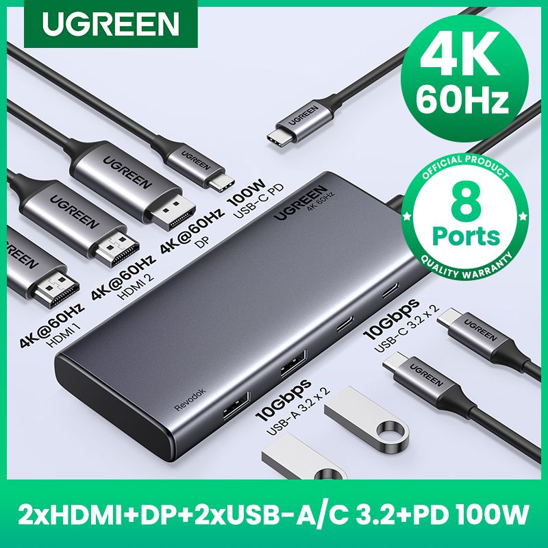 1.8 in 1 USB C Laptop Docking Station: UGREEN triple docking station equipped with two 4K HDMI ports, a 4K DisplayPort, two 10 Gbps USB-C 3.2 Gen 2 ports, two 10 Gbps USB-A 3.2 Gen 2 ports, 100W Power Delivery