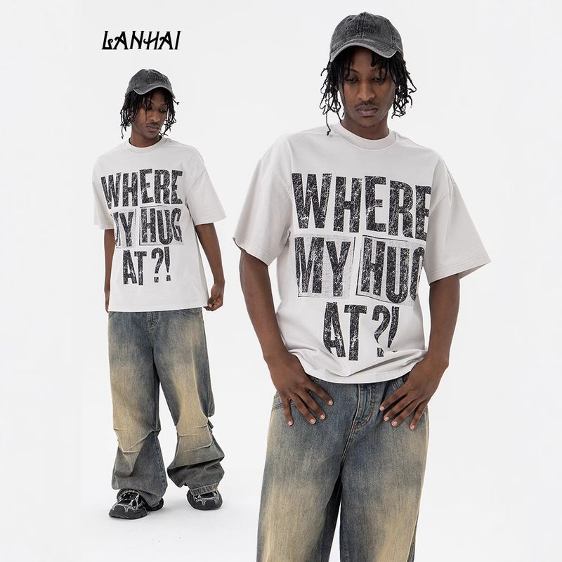 Unbeatable Quality Lanhai Men's 2025 Spring/Summer New Product Trendy Brand Destruction Letter Printing Pure Cotton Round Neck Short Sleeve