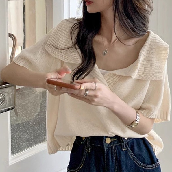 Unique and unique niche design, thin ice silk knit shirt, short sleeved women's summer small fragrance style V-neck top,