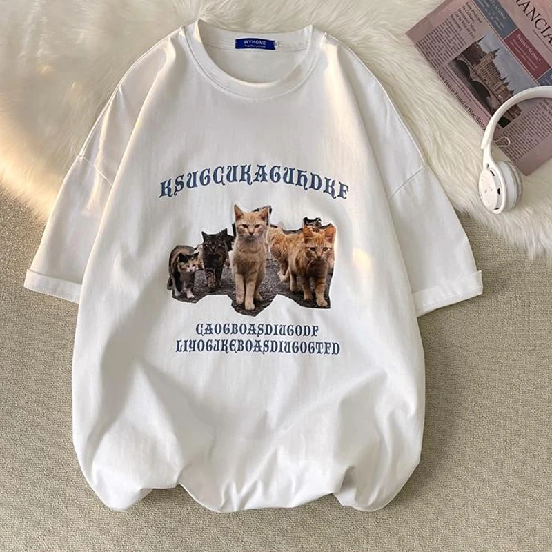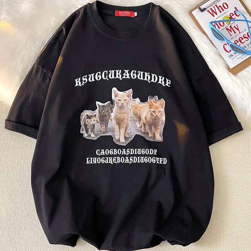 Vintage Female Cat Print T Shirt Summer New Youth Trend Short-sleeved T-shirt Men Clothing Haruku Punk T-shirt Oversized238