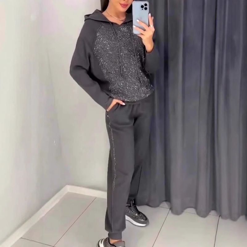 Women Two Piece Sets Pant Set Sequin Sweatshirts Loose Casual Matching Sets Hooded Tops High Elastic Waist Splice Long Pants