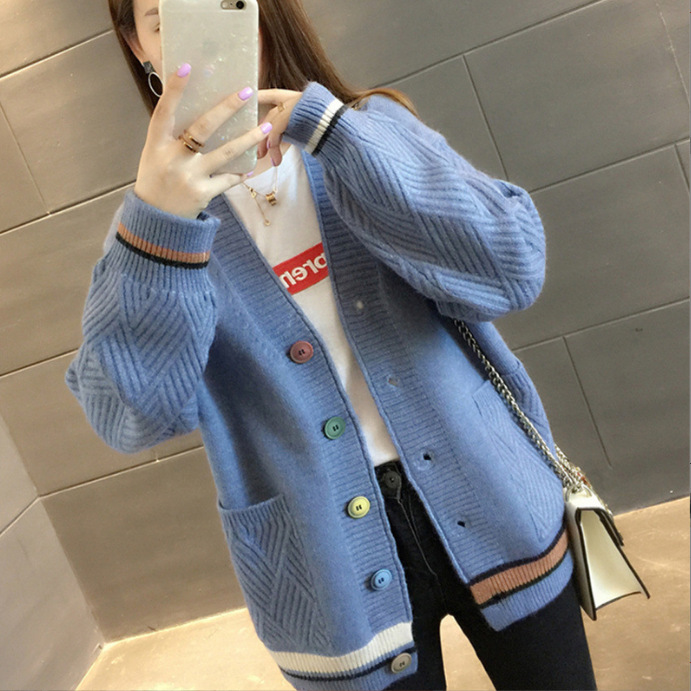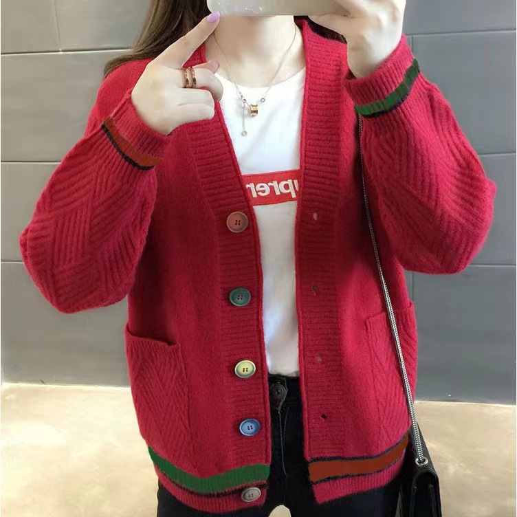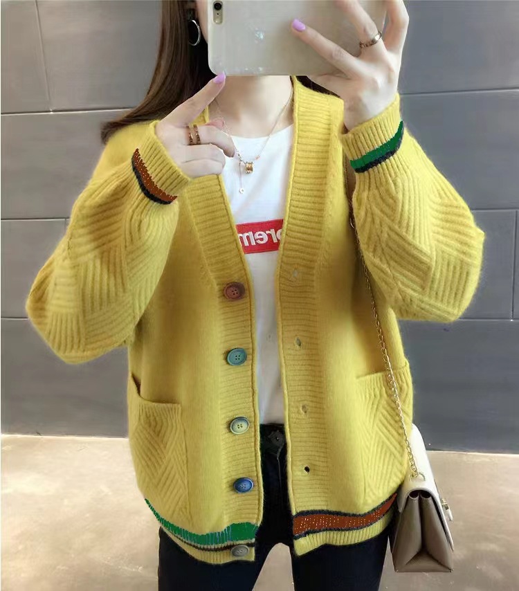 Women's Clothing Knitted Sweater V Neck All match Small Cardigan Jacket Women's Colorblock Sweater