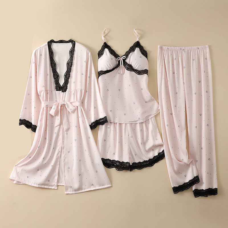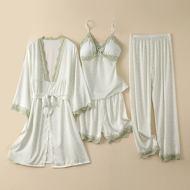 Women's Clothing Printed pajamas women summer sexy thin four piece set sexy with chest pads spring and autumn silk nightgown nightdress home clothes