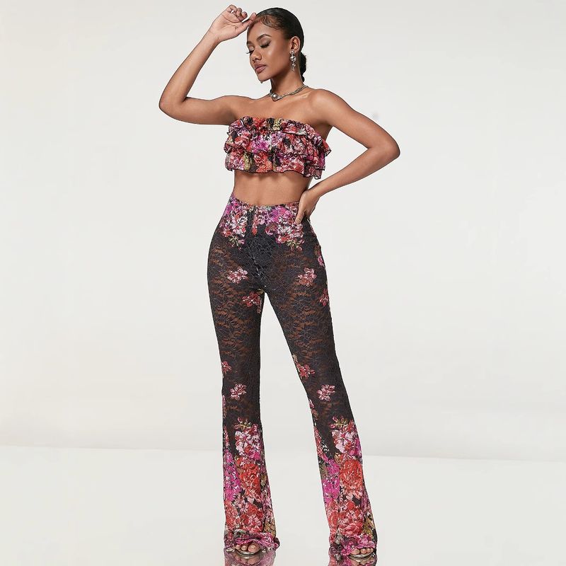 Women's Fashion Super Design Sense Unique Print Tube Top Tight See-through Lace Flared Pants