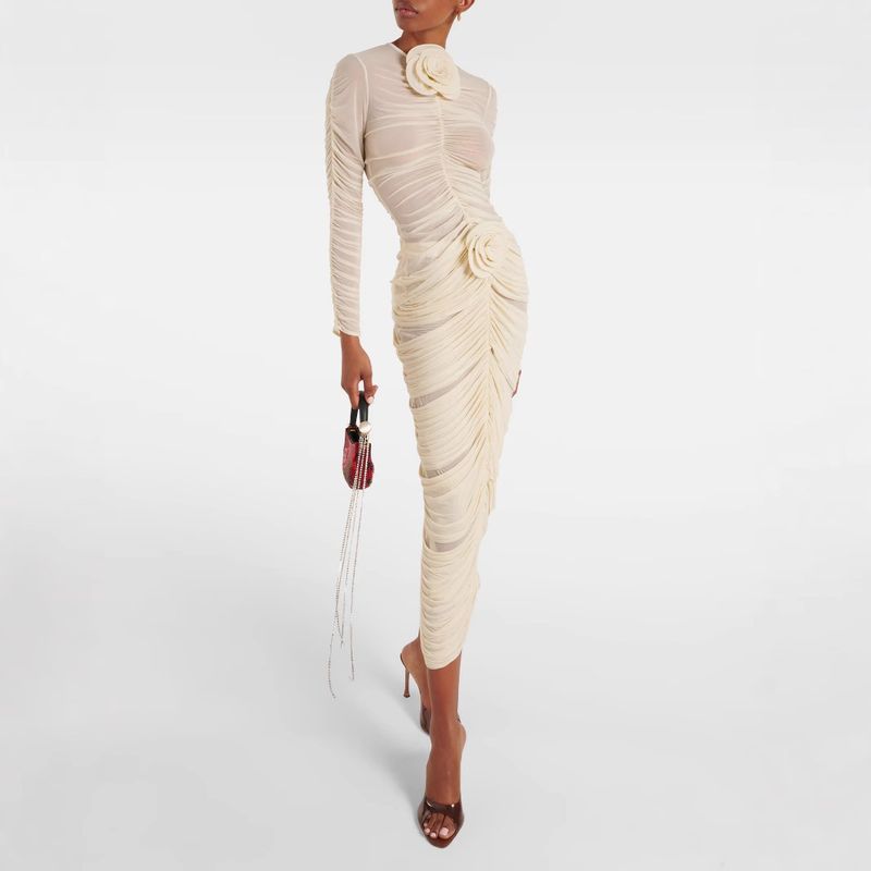 Women's Two-Piece Set With High-End Feel, Ruched Mesh Bodycon Midi Skirt, French Round Neck, 3D Floral Design